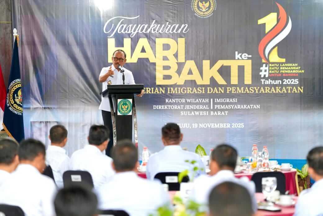 Mamuju – Gubernur Sulawesi Barat (Sulbar), Suhardi Duka menghadiri tasyakuran Hari Bakti ke-1 Kementerian Imigrasi dan Pemasyarakatan Kantor Wilayah (Kanwil) Direktorat Jenderal Imigrasi dan Pemasyarakatan Sulbar, Rabu, 18 November 2025.