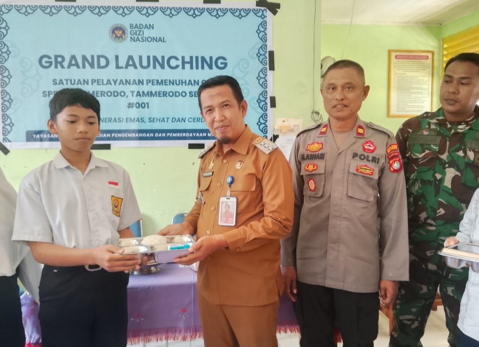 MAJENE – CAMAT Tammerodo Sendana, Edi Bastian memulai Grand Launching Makanan Bergizi Gratis (MBG) di SMP 4, Senin 27 Oktober 2025.