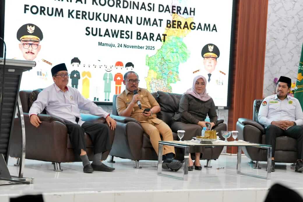 Mamuju – Gubernur Sulawesi Barat, Suhardi Duka menghadiri Rapat Koordinasi (Rakor) Daerah Forum Kerukunan Umat Beragama (FKUB) Sulbar yang digelar di Aula Kantor Kanwil Kemenag Sulbar, Senin, 24 November 2025.