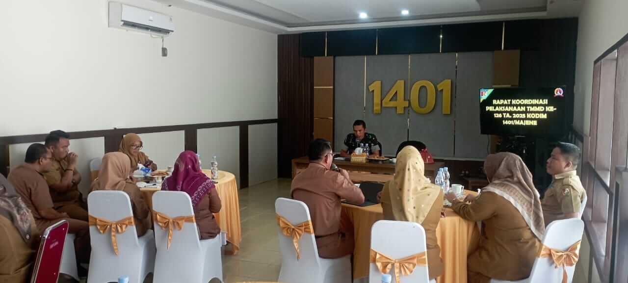 Majene – Dalam rangka mendukung suksesnya kegiatan TNI Manunggal Membangun Desa (TMMD) ke-126 Kabupaten Majene, Dandim 1401/Majene, Letkol Czi I Made Bagus Asmara Putra, S.T., I.M.P bersama Pemerintah Kabupaten Majene menggelar rapat koordinasi persiapan pelaksanaan TMMD Tahun 2025, yang berlangsung di Ruang Rapat Kodim, pada hari Selasa (30/9/2025).