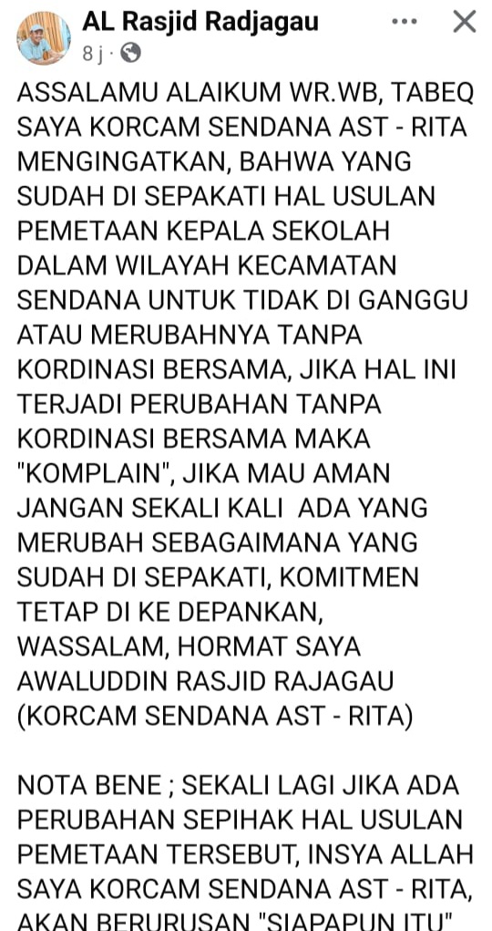 Dalam kutipannya, “ASSALAMU ALAIKUM WR.WB, TABEQ SAYA KORCAM SENDANA AST – RITA MENGINGATKAN, BAHWA YANG SUDAH DI SEPAKATI HAL USULAN PEMETAAN KEPALA SEKOLAH DALAM WILAYAH KECAMATAN SENDANA UNTUK TIDAK DI GANGGU ATAU MERUBAHNYA TANPA KORDINASI BERSAMA, JIKA HAL INI TERJADI PERUBAHAN TANPA KORDINASI BERSAMA MAKA “KOMPLAIN”, JIKA MAU AMAN JANGAN SEKALI KALI ADA YANG MERUBAH SEBAGAIMANA YANG SUDAH DI SEPAKATI, KOMITMEN TETAP DI KE DEPANKAN,