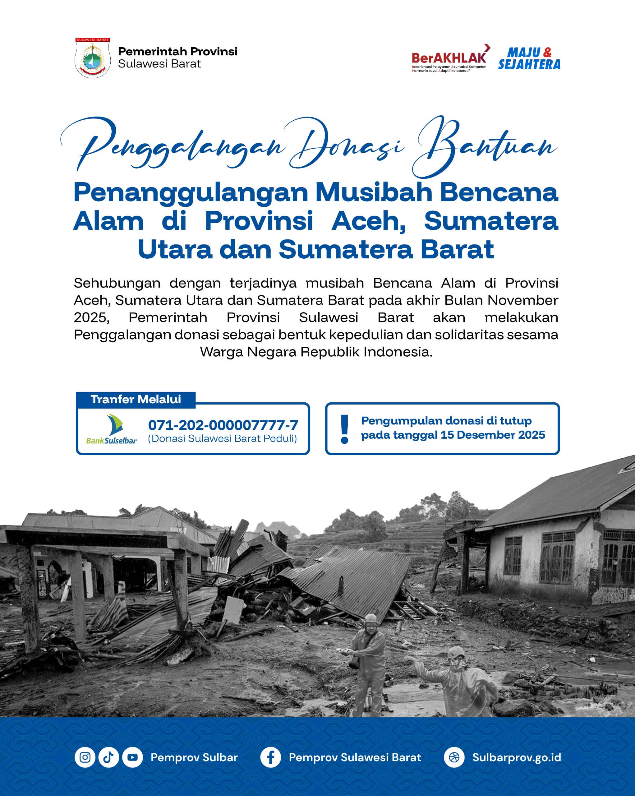 Mamuju – Pemerintah Provinsi Sulawesi Barat resmi mengumumkan penggalangan donasi untuk membantu penanggulangan musibah bencana alam yang melanda sejumlah wilayah di Provinsi Aceh, Sumatera Utara, dan Sumatera Barat pada akhir November 2025, , 4 Desember 2025.