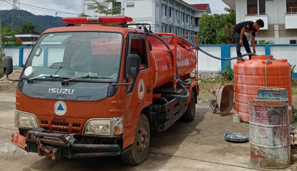 Distribusi air bersih dilakukan dengan menggunakan armada tangki BPBD Sulbar dan disalurkan langsung ke kantor BNNP Sulbar guna mendukung kelancaran aktivitas pelayanan dan operasional perkantoran.