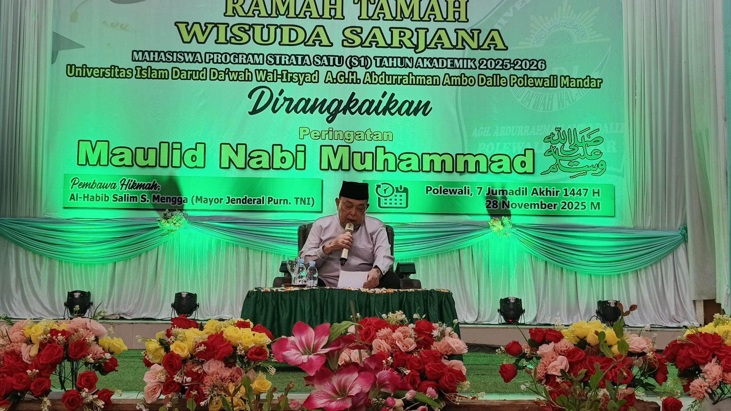 Dalam tausiyahnya, Salim S. Mengga merupakan pasangan Gubernur Sulbar Suhardi Duka ini menekankan bahwa kehadiran Nabi Muhammad SAW merupakan lahirnya peradaban baru yang menegakkan kejujuran, kasih sayang, dan kemuliaan akhlak. Ia mengajak para lulusan untuk meneladani nilai-nilai tersebut dalam kehidupan sehari-hari.